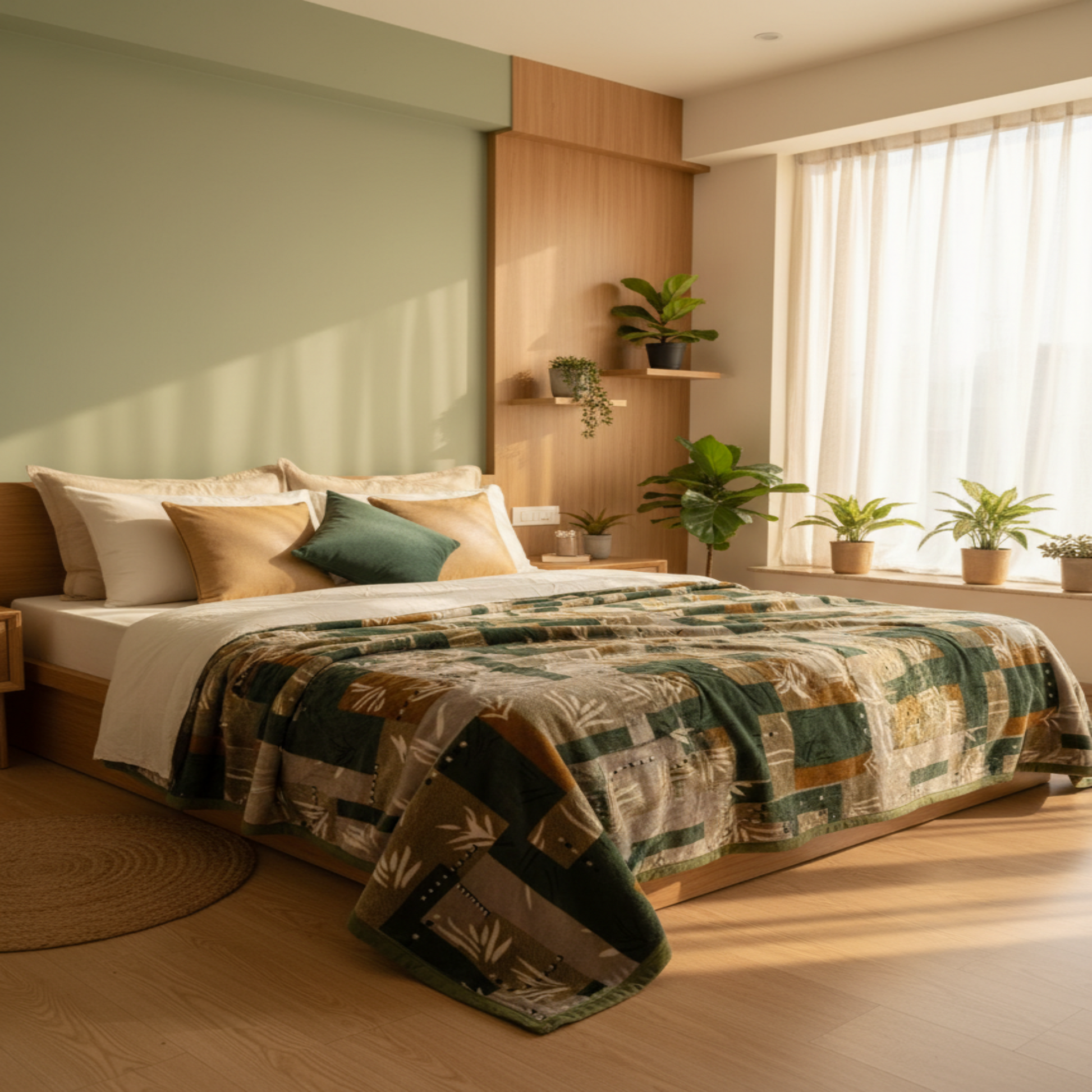 Super Soft Top Class Green Single Bed Blanket with Geometric Design